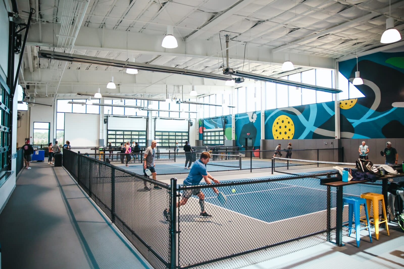 Play pickleball rain or shine on any of the 6 indoor courts, or utilize the 2 outdoor courts with riser seating (weather-permitting). New to the sport of pickleball? It’s easy and fun to learn, and SERV even offers an intro class to help you get started! And if you’re worried about waiting for a court, don’t be. SERV has TVs, an outdoor courtyard with yard games, and plenty of tables to grab food and drinks to pass the time!